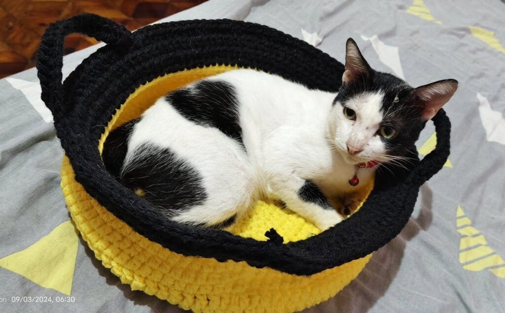 Okay, so picture this — your cat has completely taken over your favorite throw blanket again, and you’re just standing there thinking, there has to be a better option. This black and yellow crocheted cat bed is exactly that better option, and honestly, it looks so good sitting on a bed or couch that even your golden would probably try to squeeze into it.