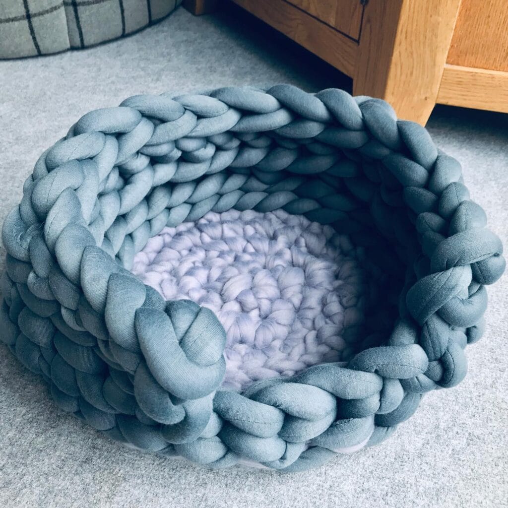 This chunky knit cat bed is made from thick fabric tube yarn in a muted slate blue-grey, hand-crocheted into a deep, rounded nest. The interior base uses chunky pale grey wool roving — softer than it looks, and way more cushioned than a flat mat. The whole thing sits roughly 12–14 inches in diameter, with walls high enough to give any pet that “tucked in” feeling.