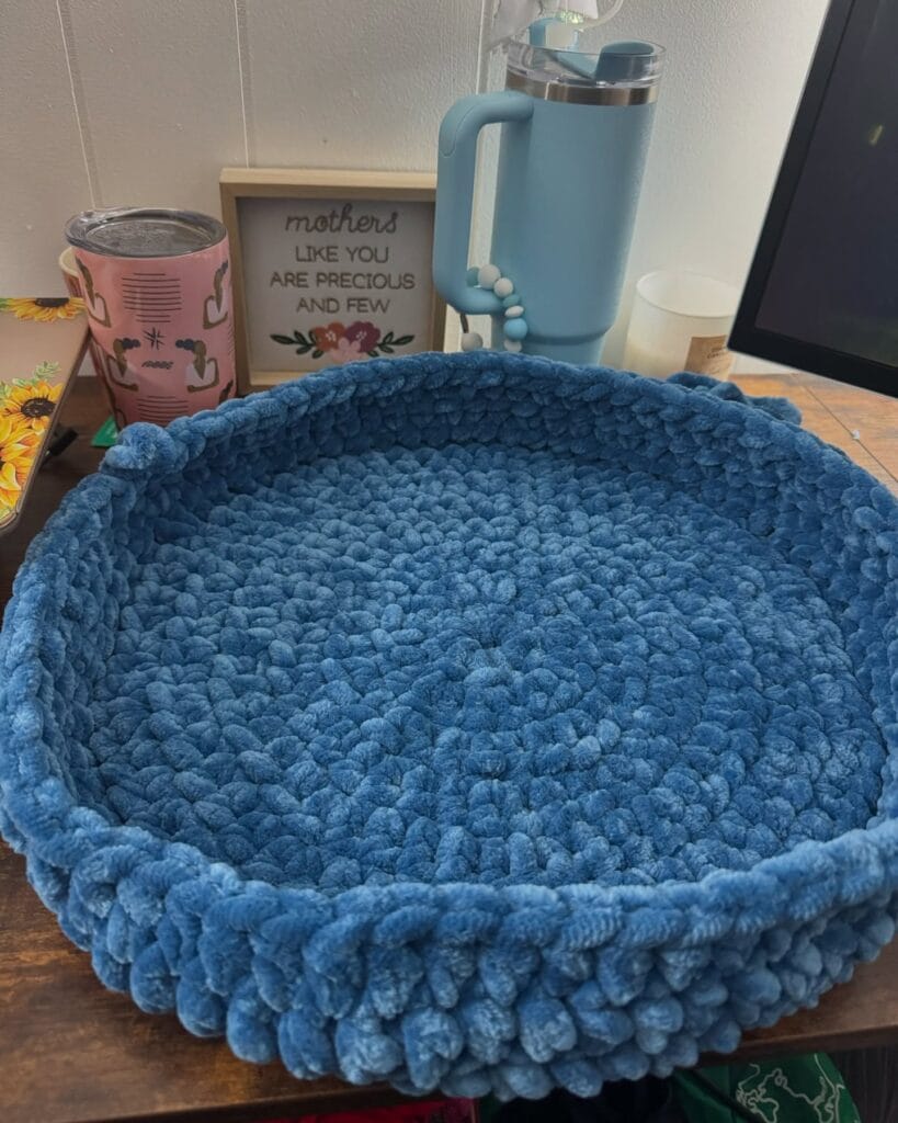 This round bed is crocheted with chunky velvet chenille yarn in a muted denim blue, and the texture is exactly what you’d want under a sleepy pet. The stitching is tight and thick — worked in continuous spiral rounds of single crochet — which gives it that satisfying, almost pillow-like density. The walls sit up on their own, roughly 4–5 inches tall, making it feel enclosed and secure without being a full cave style.