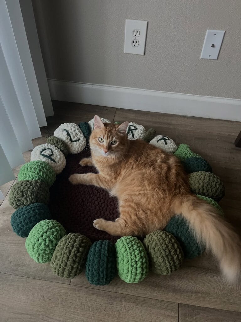 Okay, so you know how your golden retriever has that one spot on the carpet he loves, right next to the coffee table? This crocheted cat bed gives that same “I claimed this territory” energy, but make it cute.