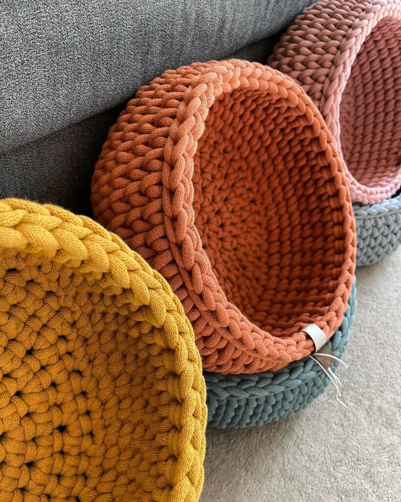 Each bed is crocheted from thick cotton rope — the kind that holds its circular shape without any internal frame. That braided rim you see on the terracotta bed? That’s a finishing technique called a chain border, and it keeps the edges from curling while adding that sculptural look. The mustard yellow one uses a dense bobble stitch across the base, which creates that bumpy, cloud-like surface cats (and honestly, small dogs) sink right into.