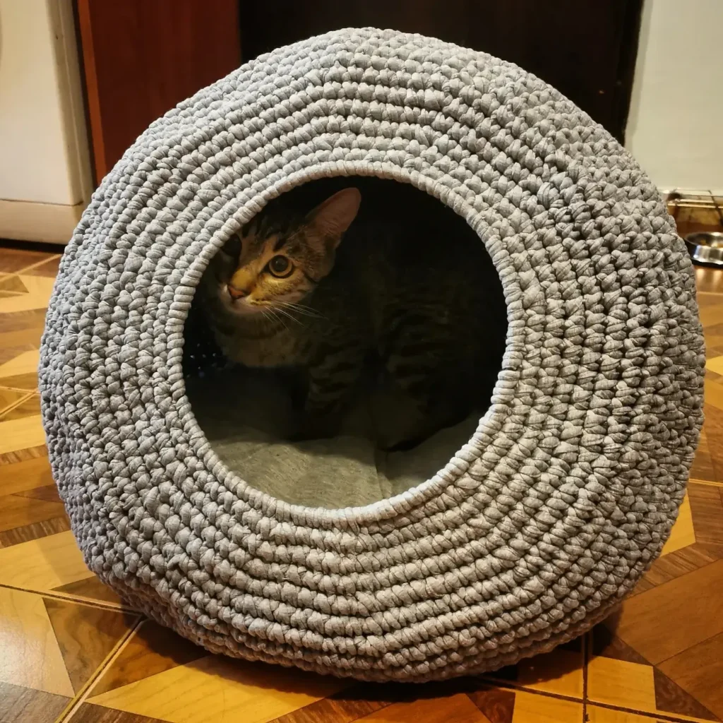 You know that feeling when your golden leaves her bed again to curl up in a laundry basket? Cats are the same way — they want a cave, not a cushion. This crochet cat bed is basically that, but make it fashion.