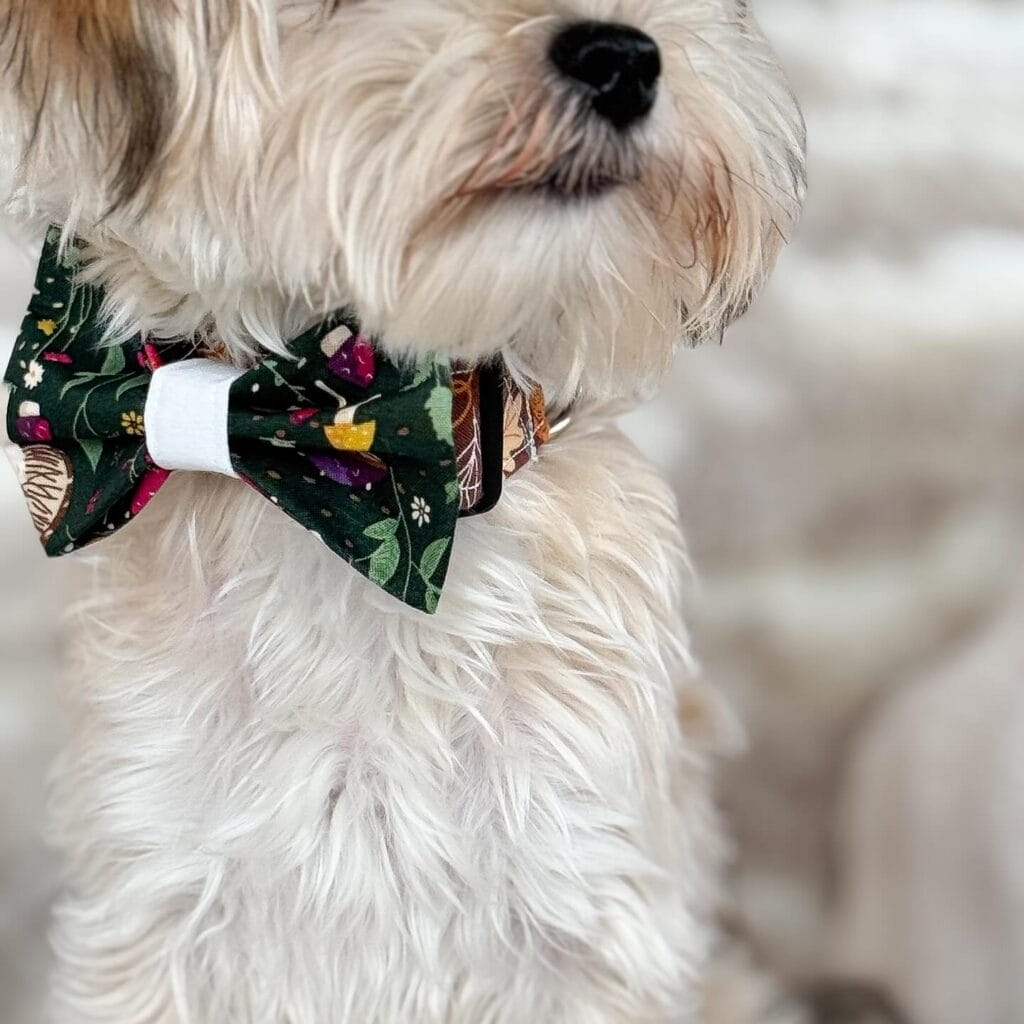 #1: Dark Floral Bow Tie Collar on a Fluffy White Dog