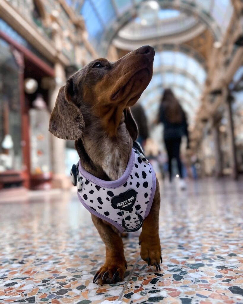 You know that feeling when your dog trots into a fancy space and somehow looks like she belongs there more than anyone else? That’s exactly the energy here. A chocolate dachshund strutting through a glass-canopy arcade — all terrazzo floors and arched ceilings — wearing a Pretty Pup London dalmatian-print harness with lavender trim. She’s not a pet. She’s an event.