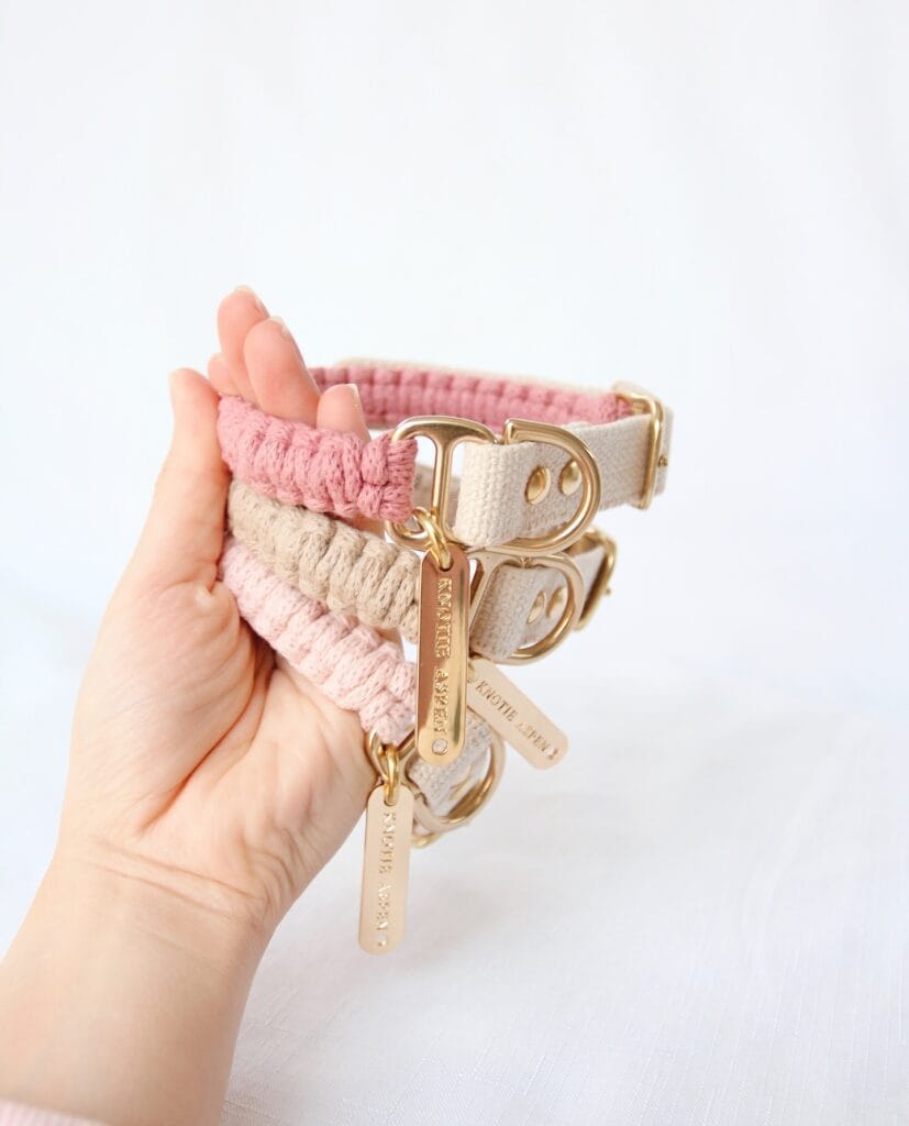 These macramé dog collars from Knotie Aspen are genuinely something else. Hand-knotted cotton rope in three shades — dusty rose, warm taupe, and blush pink — each paired with gold D-rings and engraved brand tags. The texture is chunky and tactile in the best way, like something you’d find at a boutique, not a big-box pet store.