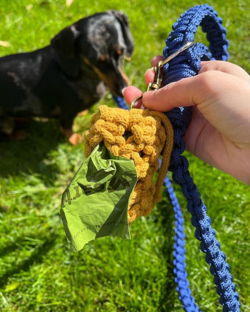 #6: Mustard Crochet Poop Bag Holder Clipped to a Navy Macramé Leash