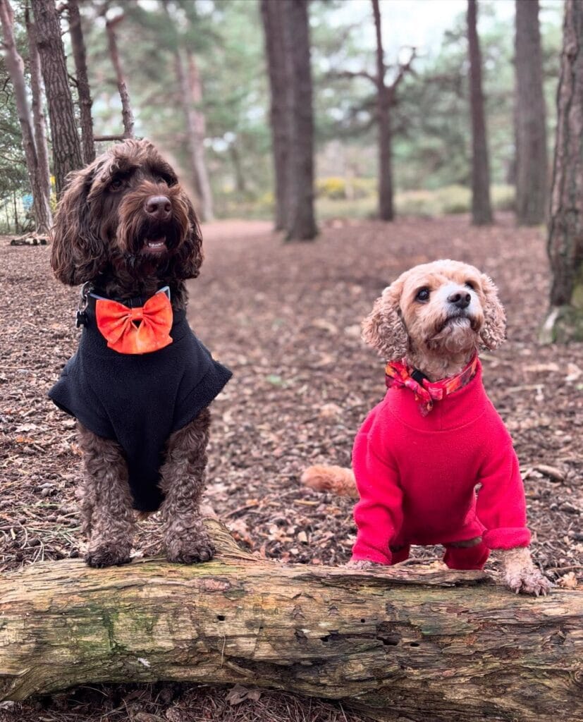 #7: Two Dogs Dressed Up for a Forest Walk in Matching Fleece Outfits
