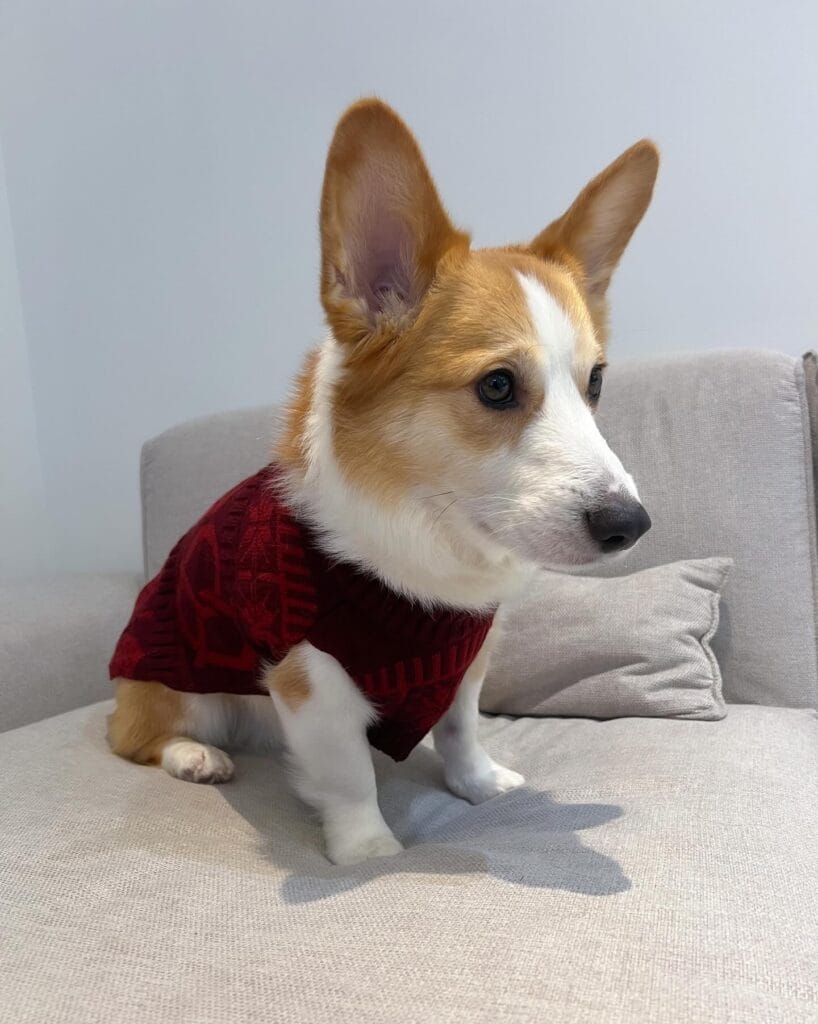 Your corgi sits on your gray sofa wearing a burgundy cable-knit sweater that matches your throw pillows perfectly. You snapped twelve photos because the coordinated aesthetic was too good not to share.