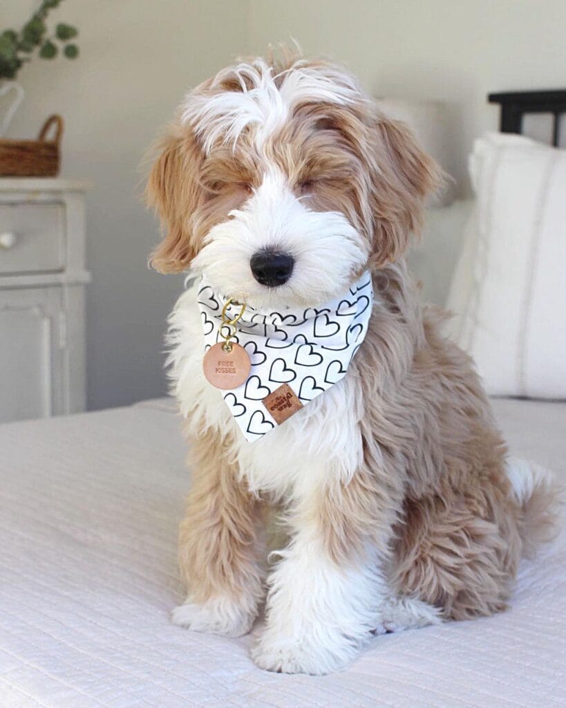 Your puppy tilts his head during photos, and that plain collar just disappears. This reversible bandana features a white heart pattern on one side, contrasting solid on the other, plus two custom leather tags. You’ll need 1/2 yard of cotton fabric ($4 at any craft store), a leather scrap ($2), and 20 minutes. No sewing machine required if you use fabric glue and iron-on hem tape.
