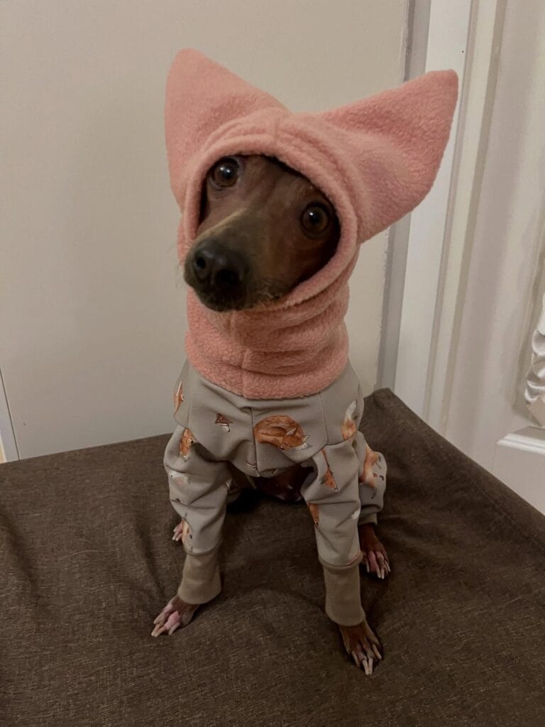 Your Italian Greyhound shivers in January. Regular hoodies tug on those delicate ears. This fleece snood slips on like a ski mask—covers the neck and head completely, but those adorable cat ears poke through dedicated openings.