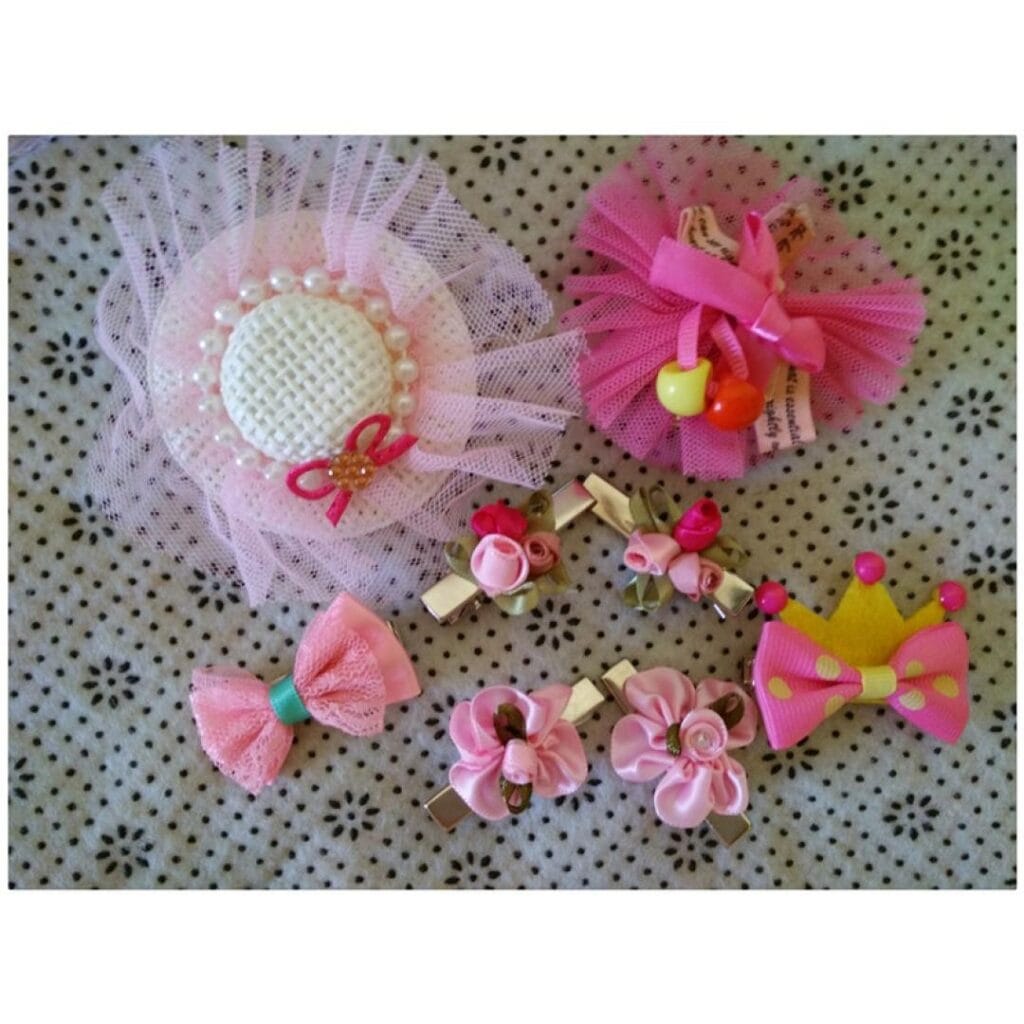 Grab cotton fabric scraps (5×3 inches per bow), alligator hair clips from the dollar store ($1 for 12), and hot glue. Cut fabric, fold edges inward, pinch the middle, wrap with thin ribbon, and glue the clip underneath. You’ll make six bows in 15 minutes. The pink tulle version costs $0.75 per bow, the fabric flower clips run $1.25 each with decorative centers.