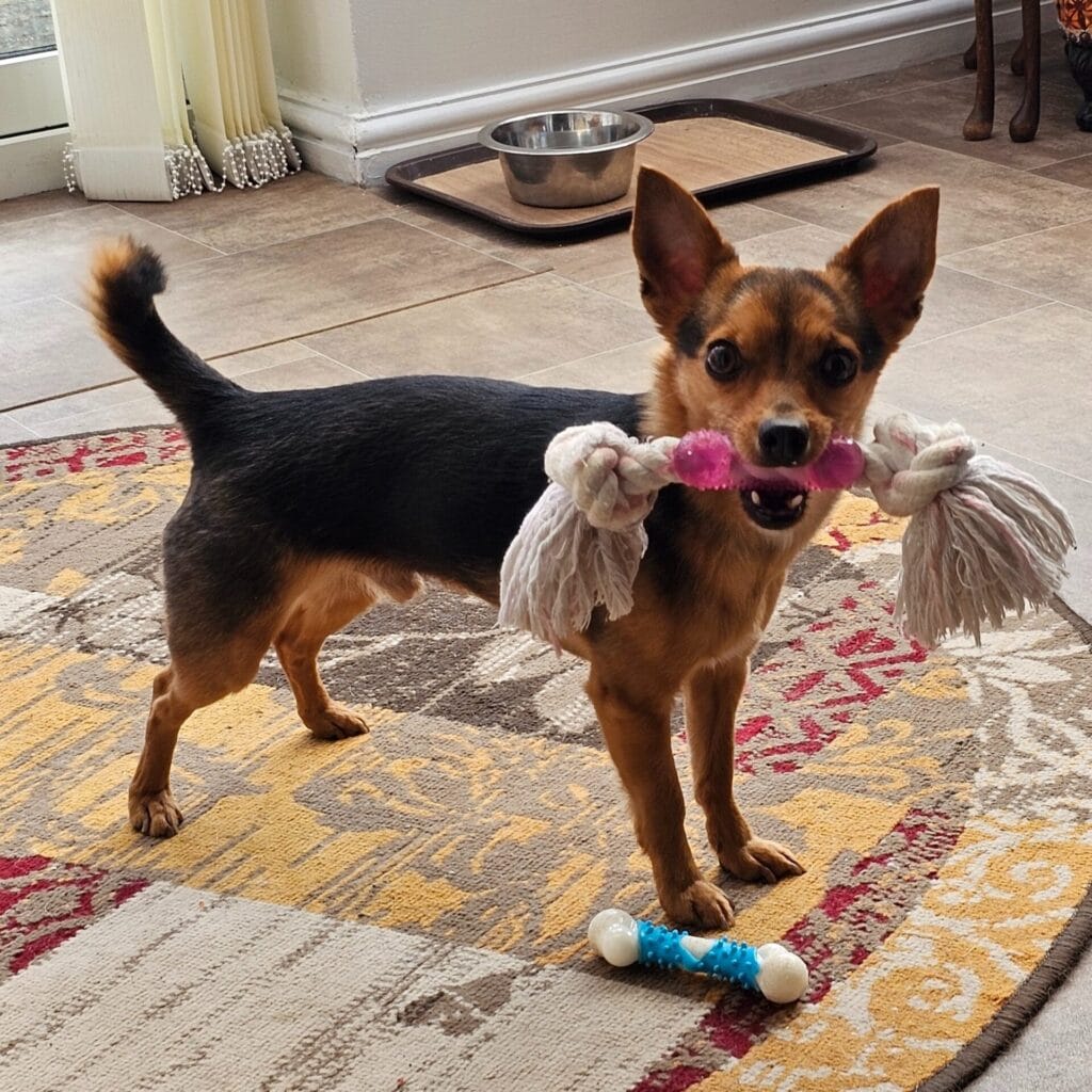 You’ll need 6 feet of 3/4-inch natural cotton rope ($4 at hardware stores), one 3-inch rubber chew tube in muted pink ($3), scissors, and 10 minutes. Cut rope in half. Thread both pieces through the tube so it sits center. Tie three knots on each side, spacing them 2 inches apart. Trim ends into frayed tassels. The cotton fibers clean teeth while your dog tugs, which means fresher breath without another product cluttering your bathroom. The weight—about 8 ounces—works for 10 to 40-pound dogs without overwhelming small jaws.