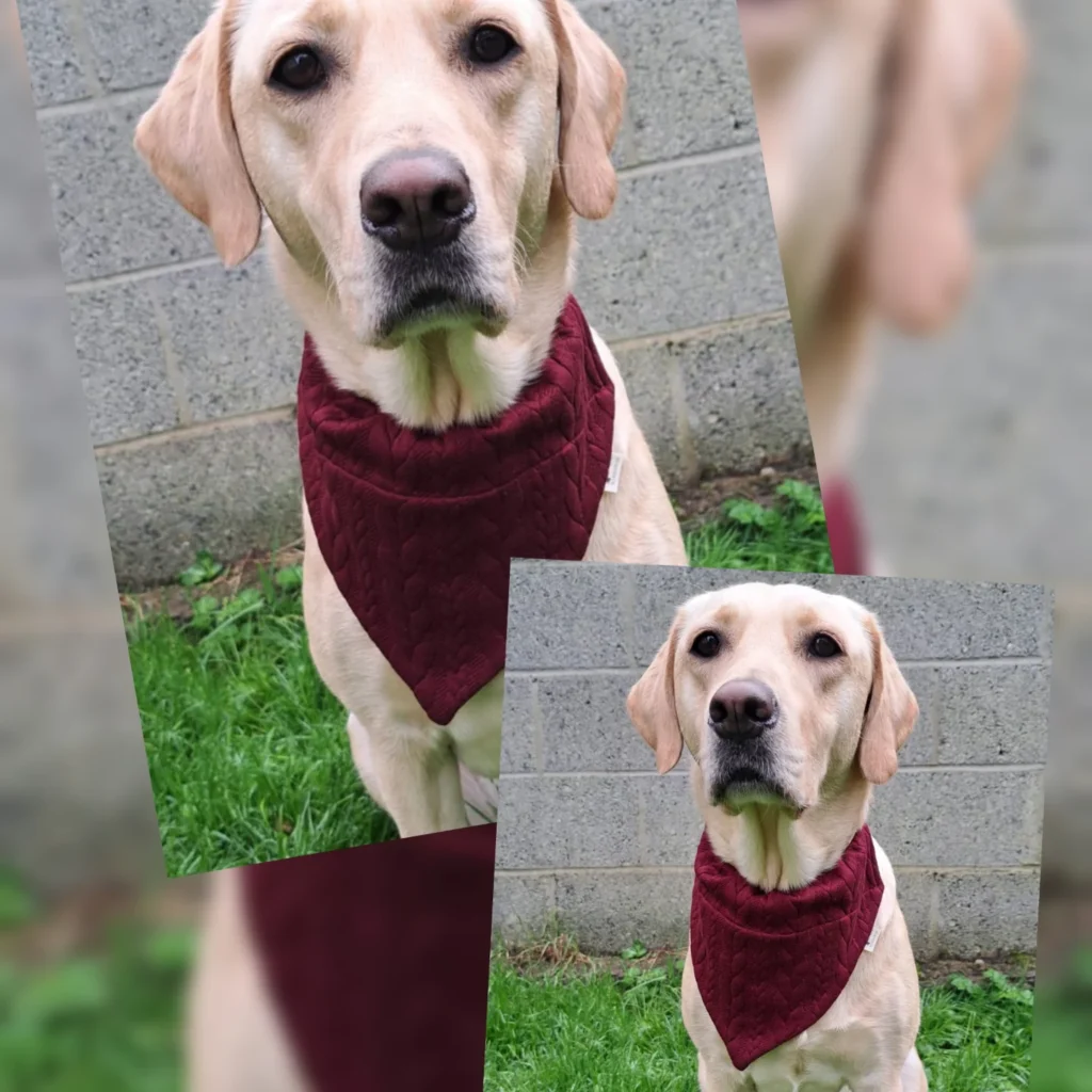 The quilted texture catches light beautifully in photos, and that deep wine color pops against cream or golden fur like the Labrador shown here. It hides dirt between washes so you can skip laundry after one muddy walk, which means less time cleaning and more time adventuring. Store finished bandanas rolled in a basket near your leash hooks so they’re ready to grab.