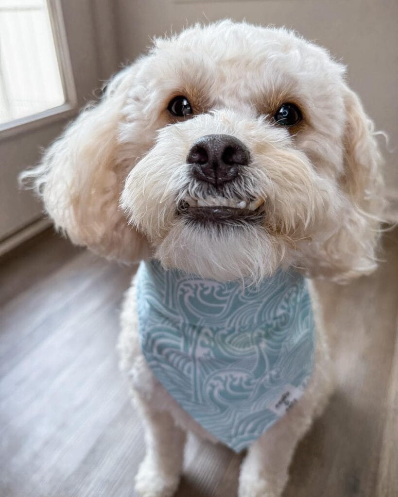 The over-the-collar slide style keeps it secure during active play. Thread the triangle’s long edge through the collar gap before buckling it on. The point drapes between shoulder blades so you can grab treats from your pocket during training sessions without fabric bunching. It’s photograph-ready in seconds—that swirl pattern catches natural light beautifully, which means your Instagram feed looks curated instead of chaotic.