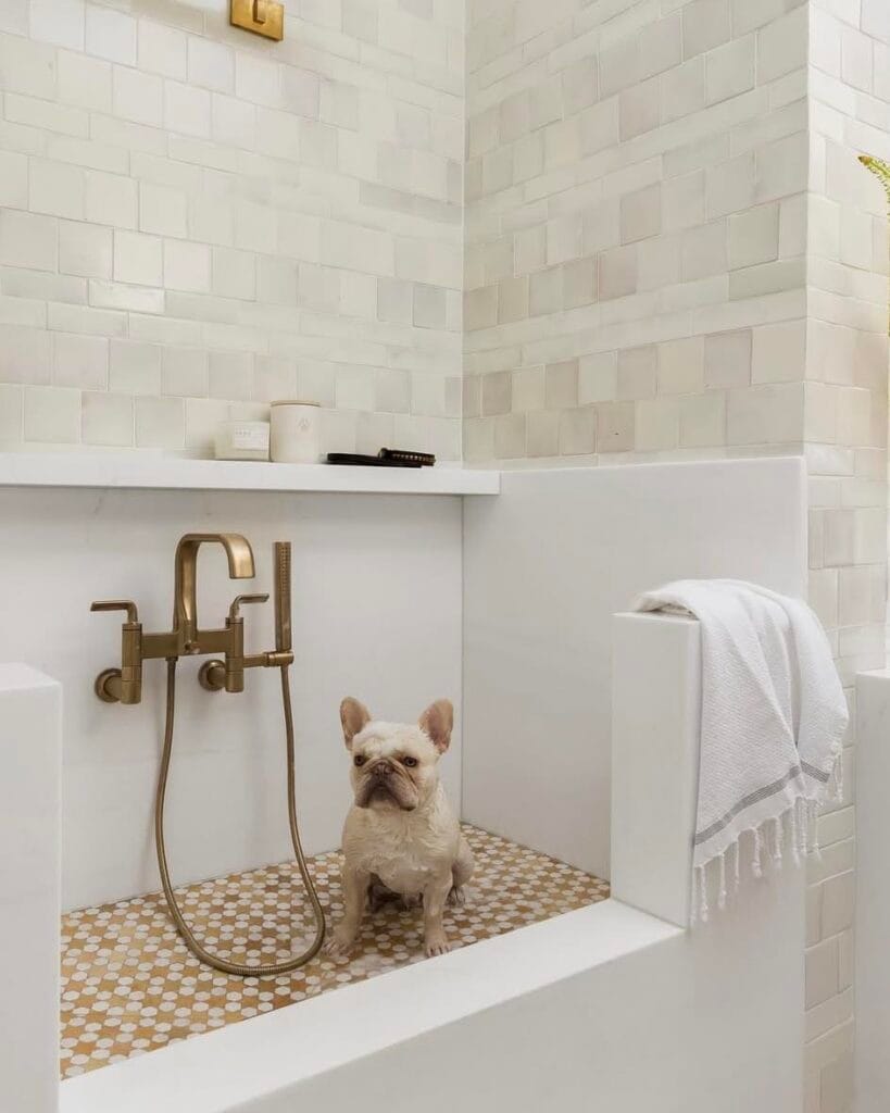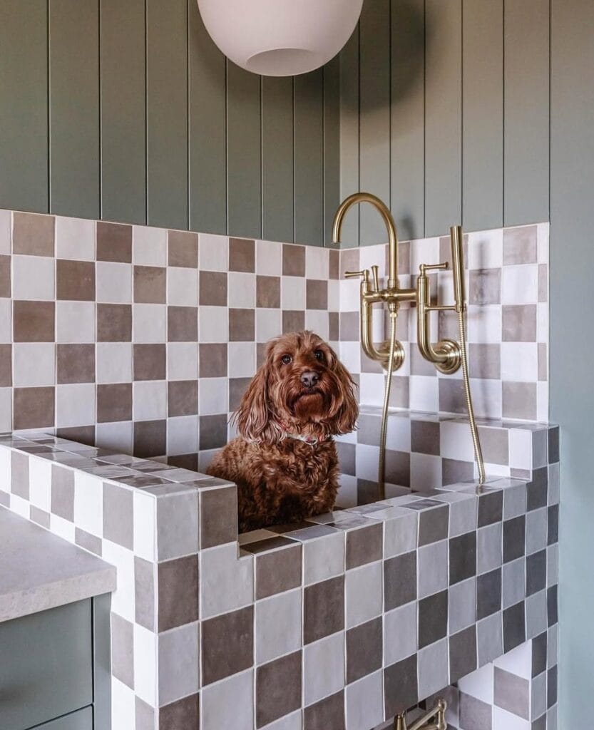 The zellige tile surface cleans with a single wipe, the brass fixtures develop a warm patina over time instead of looking dated, and the built-in basin keeps all the muddy water contained — which means your floors stay dry and your dog actually has room to stand comfortably instead of slipping around a too-small tub.
