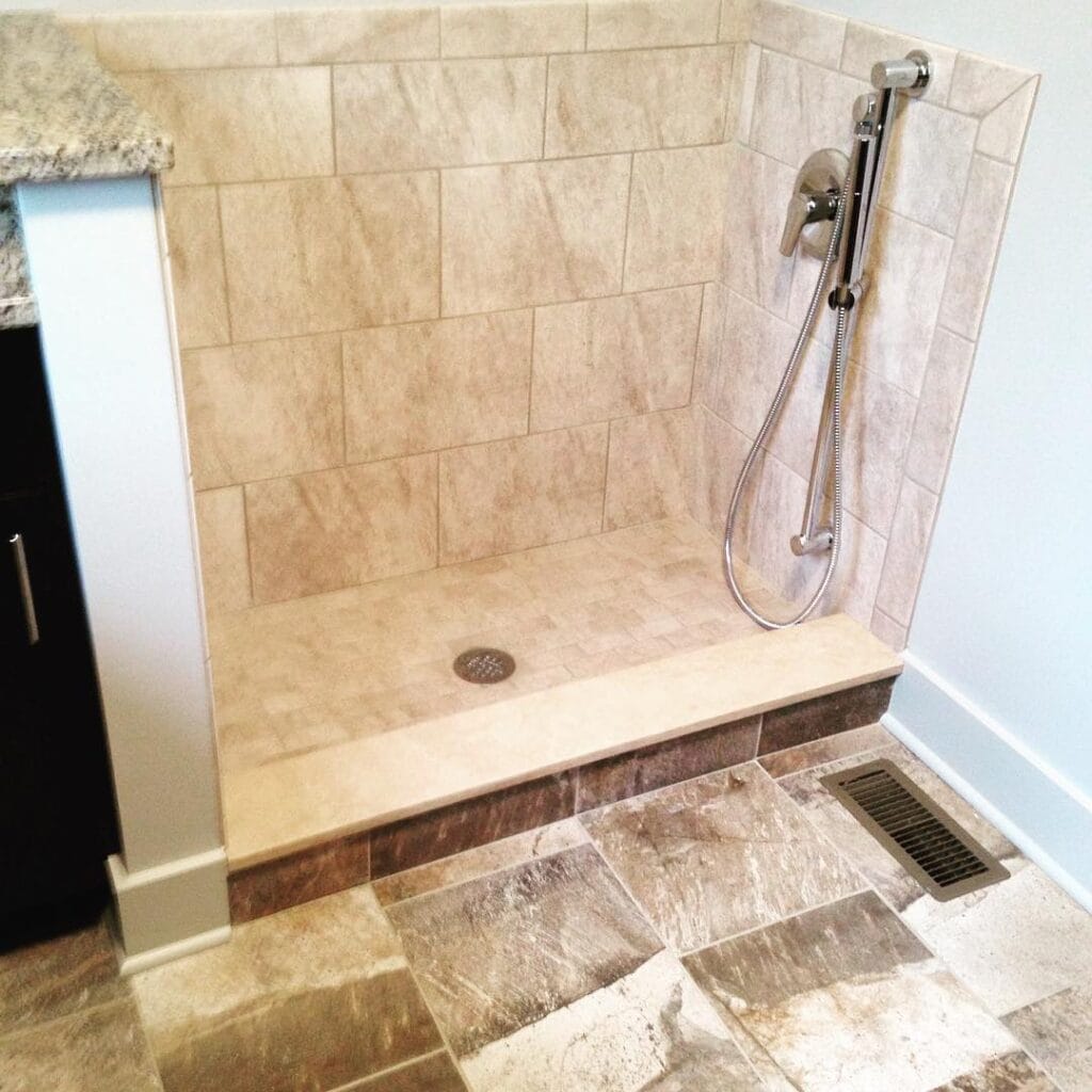 – Built-in concrete or tile bench ledge (~18″ from floor)