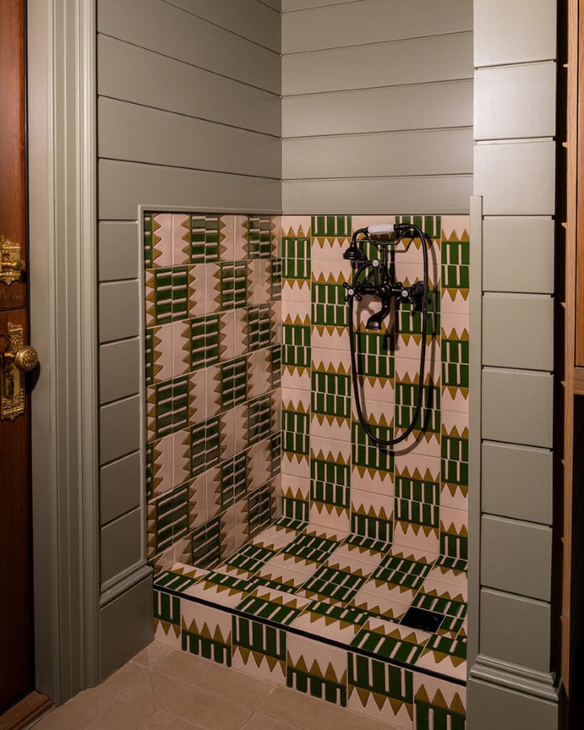 Set the black floor drain flush with the tile bed and connect your handheld bronze fixture at elbow height so you control the rinse direction. Grout everything in cream to make those green geometrics pop.