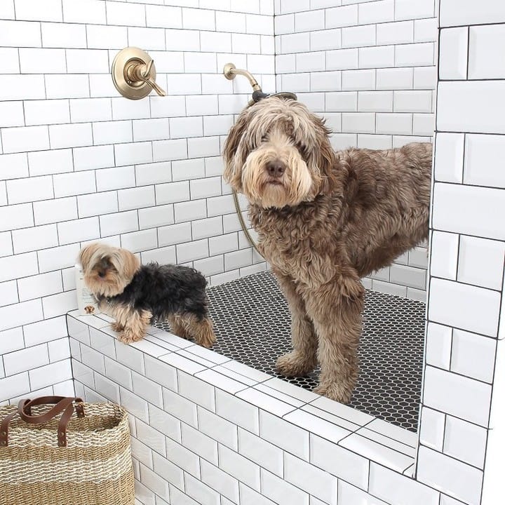 This DIY dog bathing station is set into a dedicated corner nook — tiled walls, a raised acrylic shower base, and a wall-mounted faucet system. It looks like something straight off your Pinterest board, and it works like a dream.
