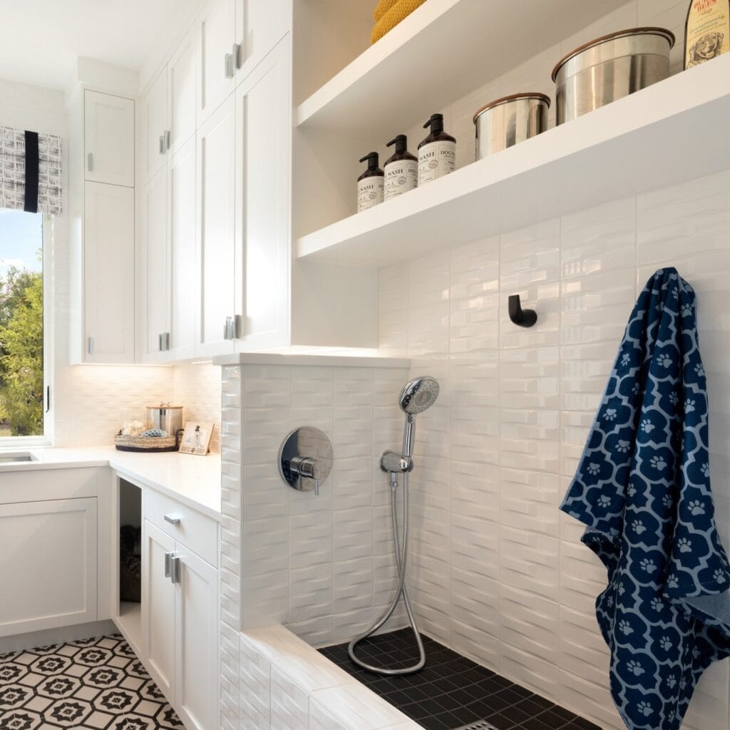 #4: Built-In Dog Wash Station with Open Shelving and Handheld Shower