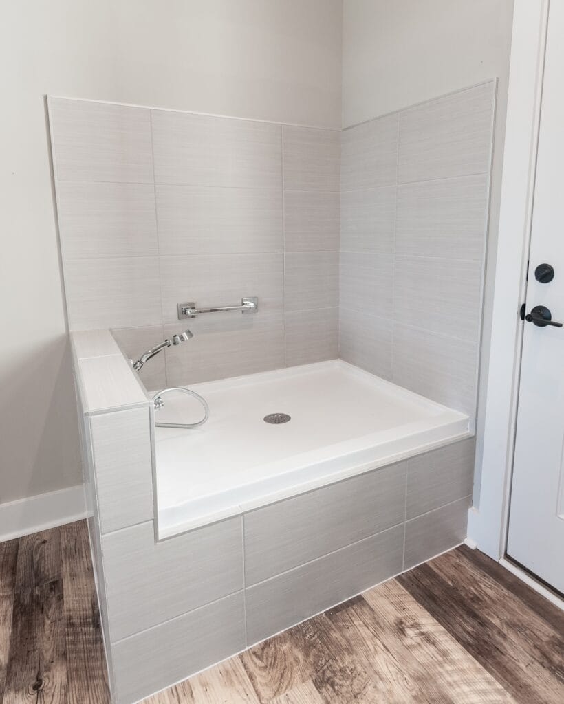 Set your acrylic shower pan into the framed base at roughly 14–16 inches off the floor — high enough that you’re not breaking your back, low enough that your dog can step or be lifted in without a struggle. That raised height + the grab bar means you keep control of a wet, wiggly 65-pound retriever without throwing out your shoulder.
