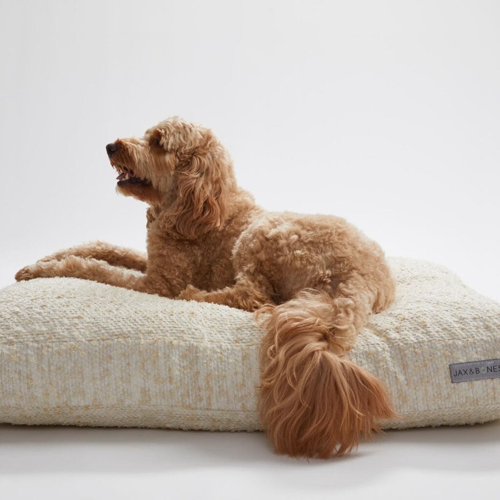That’s exactly the moment I started looking for a dog bed that could handle a big fluffy dog and still look good in my living room. And then I found this style — a boucle fabric pillow bed — and I haven’t looked back.