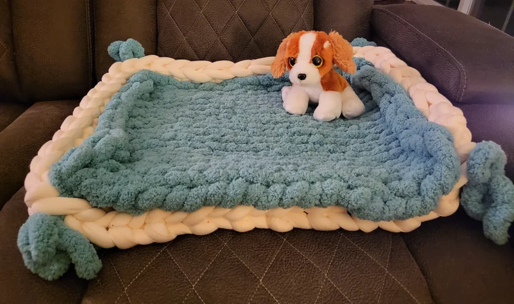 This DIY dog bed is honestly everything. It’s a teal/dusty blue chenille yarn center panel, hand-knitted in a chunky loop stitch, framed by a thick cream braided border made from arm-knit merino wool roving. The corners have teal pom-pom tassels that keep the whole thing looking Pinterest-perfect. My aunt made something similar for her husky last winter and I’m not joking — the dog refused to sleep anywhere else.