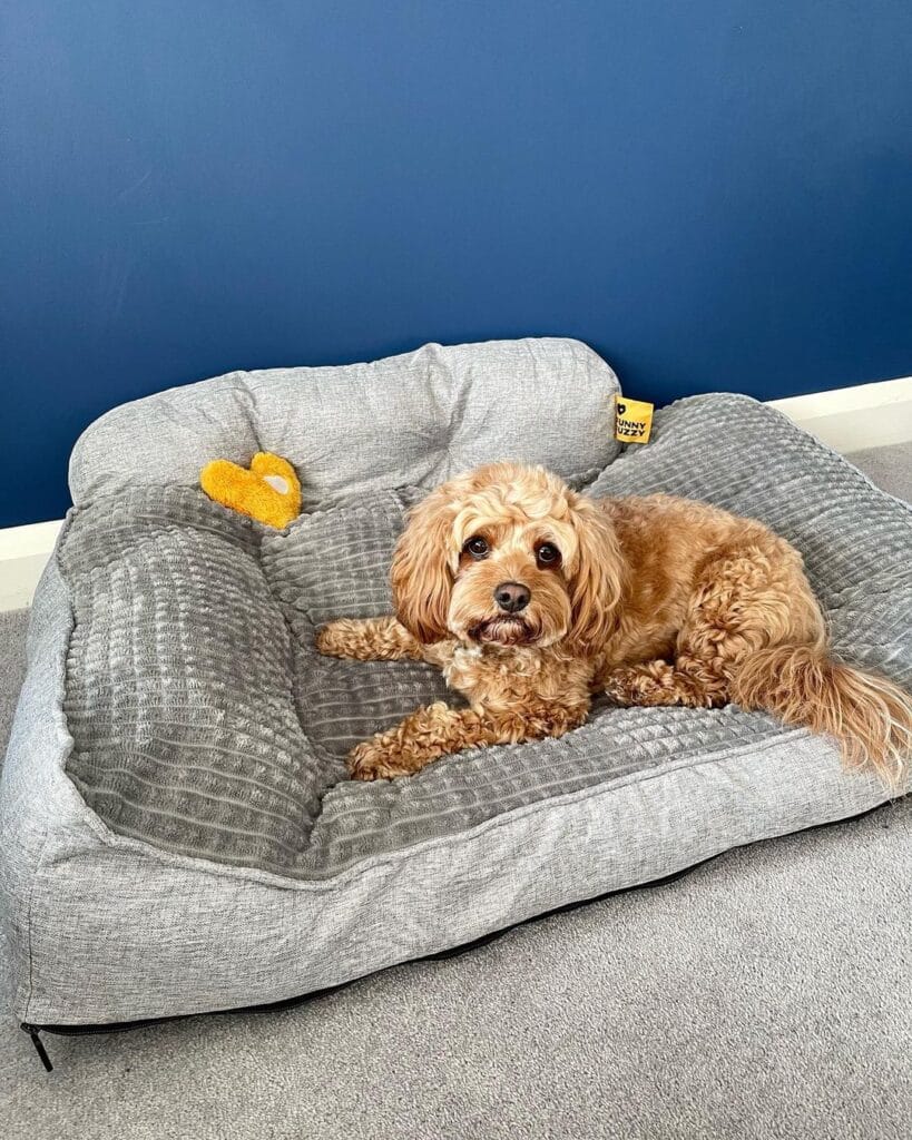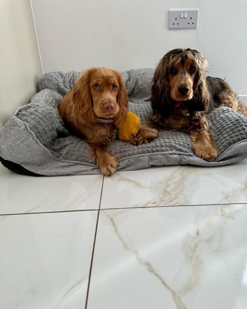 The two cockers in this photo are perfectly settled into a gray quilted fabric bolster bed with raised cushion sides and a flat center sleeping panel. It looks Pinterest-ready and the dogs are genuinely relaxed. You can recreate this for your girl.