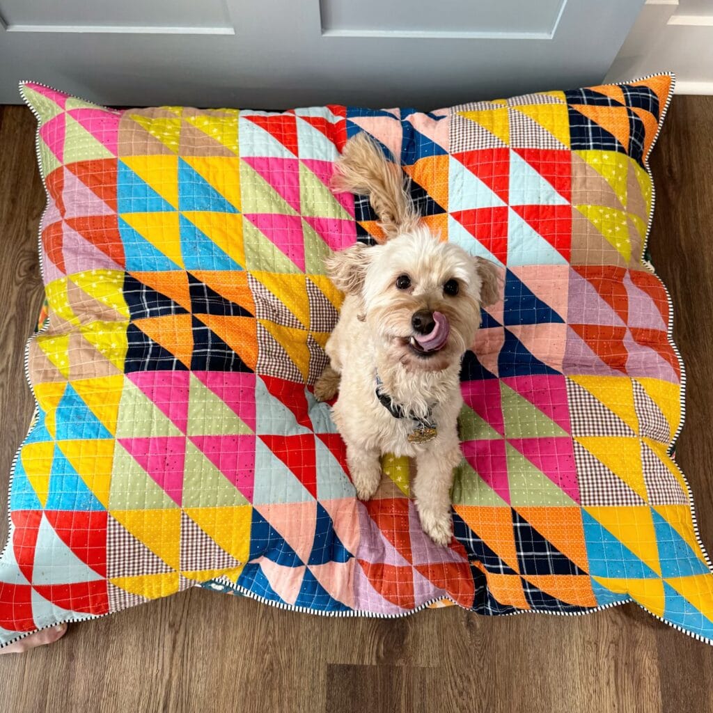 Once your quilt top is assembled, layer it over the batting and backing fabric, then baste everything together with safety pins every 4–5 inches. Quilt along the diagonal seam lines of each HST block using a walking foot — this simple diagonal quilting technique keeps the layers from shifting and gives your dog’s bed that satisfying padded, structured feel underfoot. The dense quilting also means the top holds its shape even after weekly washing, which — with a golden retriever — is basically a survival skill.
