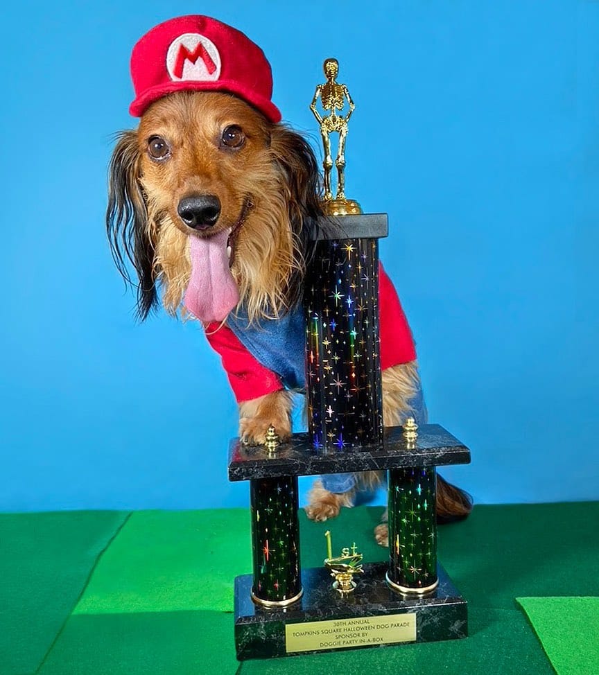 I actually saw this on Instagram and immediately sent it to three people. The red felt cap with a white “M” emblem, the denim and red two-tone shirt — it’s exactly the kind of costume that wins first place. (Literally. The pup in this photo took home the 1st place trophy at the 30th Annual Tompkins Square Halloween Dog Parade.)