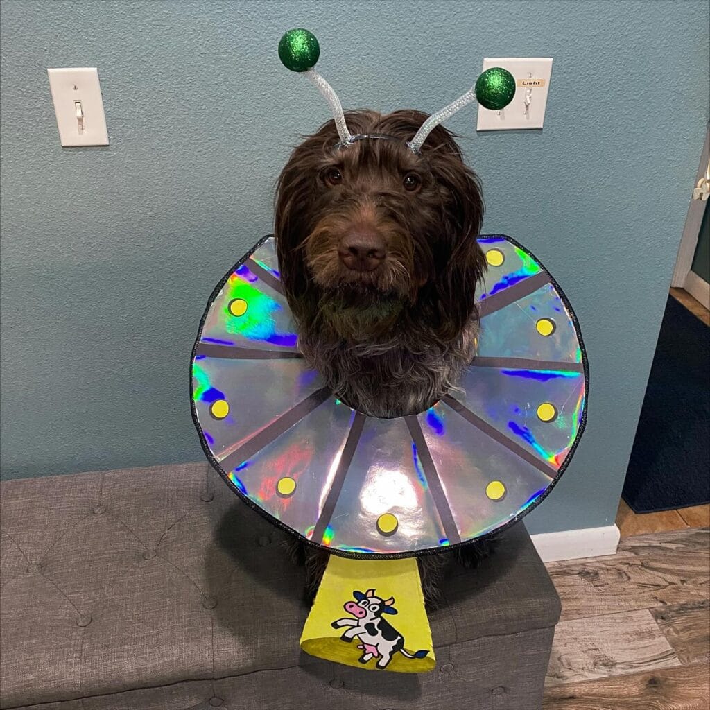 This UFO costume is genuinely one of my favorites I’ve ever seen. A dark, curly-haired pup wearing a holographic silver flying saucer collar, green glitter alien antennae, and a yellow tractor beam dangling a cartoon cow underneath? I died. My cousin made something similar for her lab last fall and it stopped traffic at the neighborhood parade.