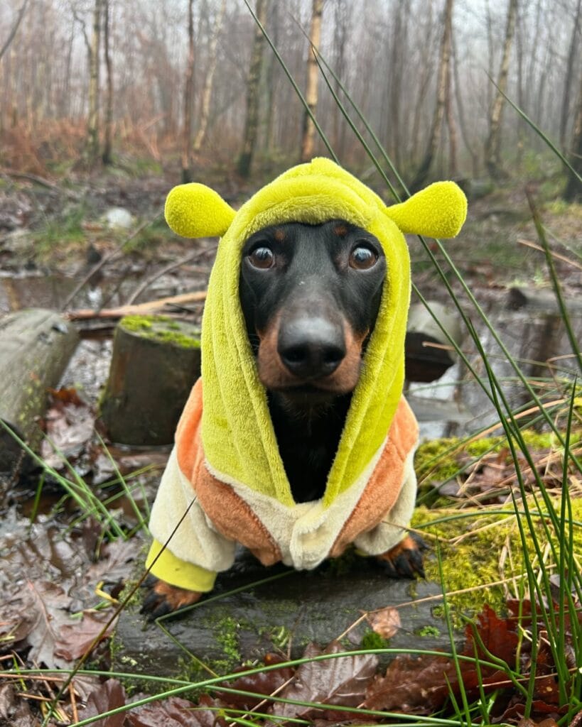 #6: DIY Shrek Hoodie Costume for Your Dachshund (Works for Any Small Dog!)