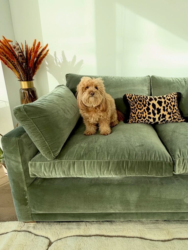 That’s why this one got me. A sage green velvet mini couch built specifically for your dog — so they get their throne and your actual furniture survives.