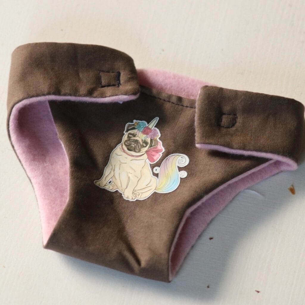 This brown cotton twill and pink fleece diaper is honestly the cutest solution I’ve seen. The snap closures on both sides keep everything secure, and that iron-on unicorn pug patch? Chef’s kiss.