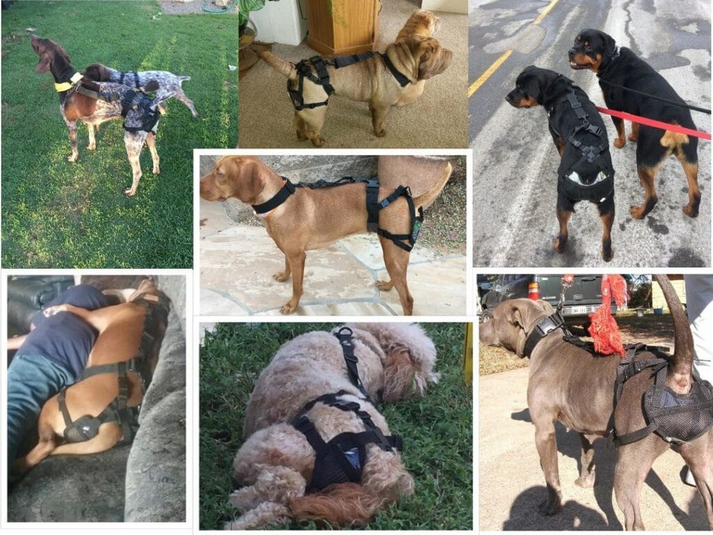 This one’s a game-changer, girl. Looking at these photos, what people are doing is converting a standard black nylon dog harness into a full diaper-support system by adding a fabric pouch that sits snug against the belly and rear.
