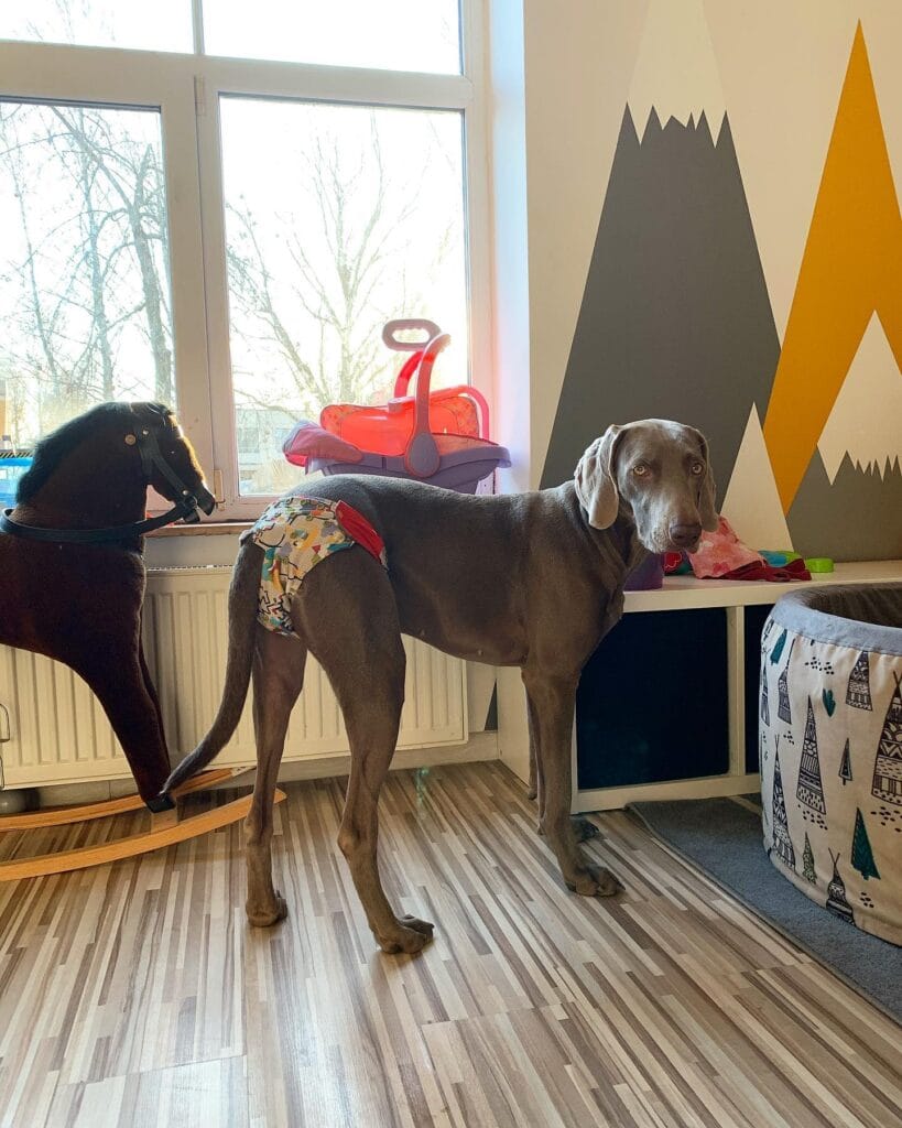 This diaper in the photo is giving me everything. It’s a cloth reusable dog diaper made from a colorful, stretchy cotton-blend fabric with a red elastic waistband that wraps snug around the midsection. The fit on this Weimaraner looks genuinely secure — no sagging, no shifting.