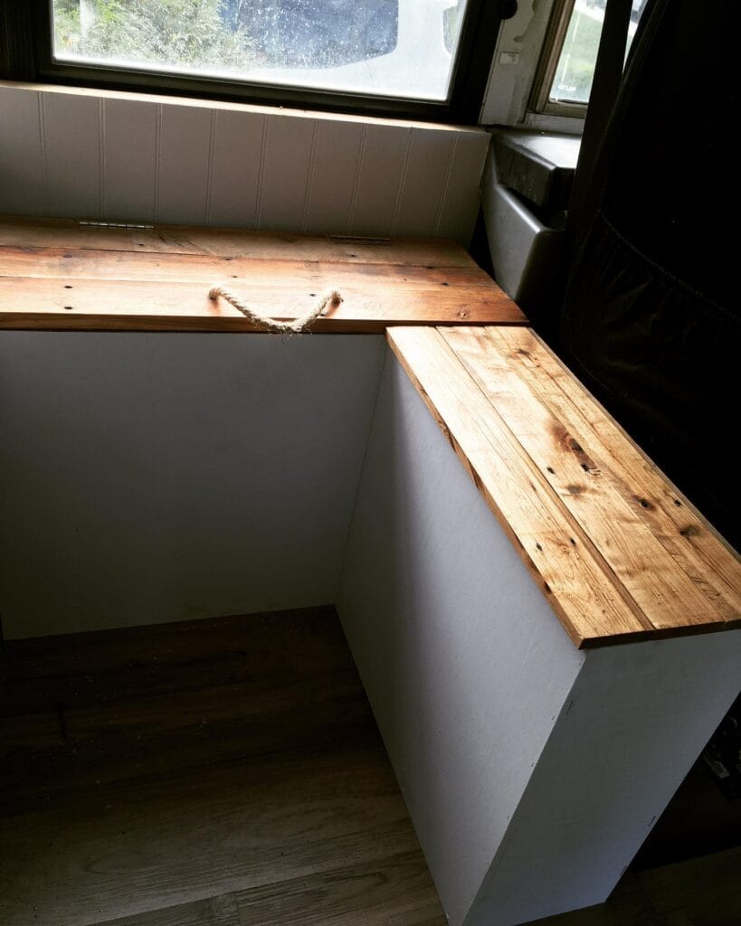 Cut your reclaimed wood planks to fit the L-shaped top, then stain them in a warm tone that contrasts the white base. This is the key: the lid sits on piano hinges at the back, so you can flip it open with one hand while scooping food with the other — zero bending, zero wrestling with a clunky bin.