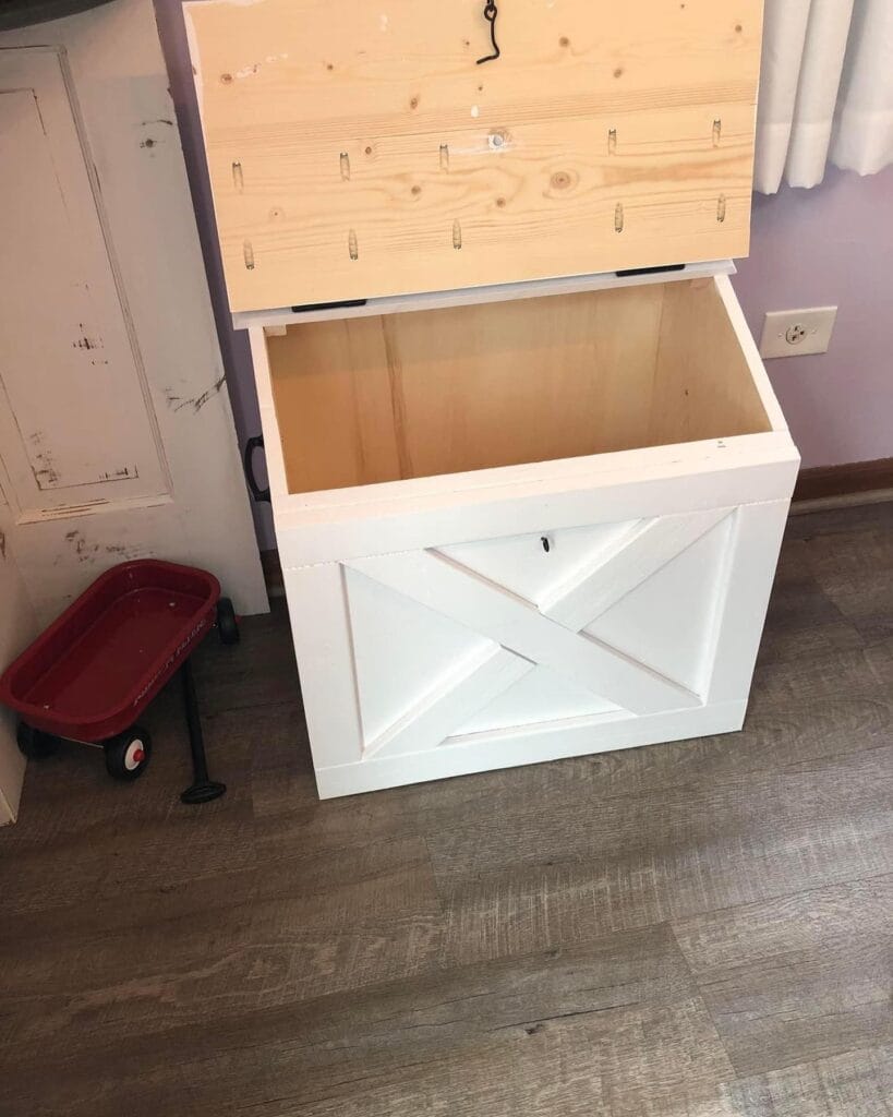 #5: DIY Farmhouse Toy Box Turned Dog Food Storage — The X-Brace Chest That Actually Looks Good in Your Living Room