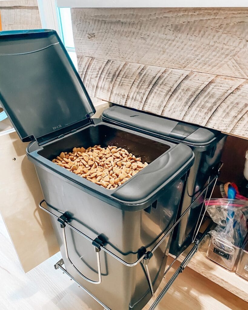 This one uses a pull-out cabinet organizer with chrome wire rails mounted inside a lower kitchen cabinet. Two dark charcoal gray plastic bins sit side by side on the sliding rack — one holds dog kibble, the other can store cat food (that little “CAT” label on the acrylic container to the right? chef’s kiss for organization lovers).