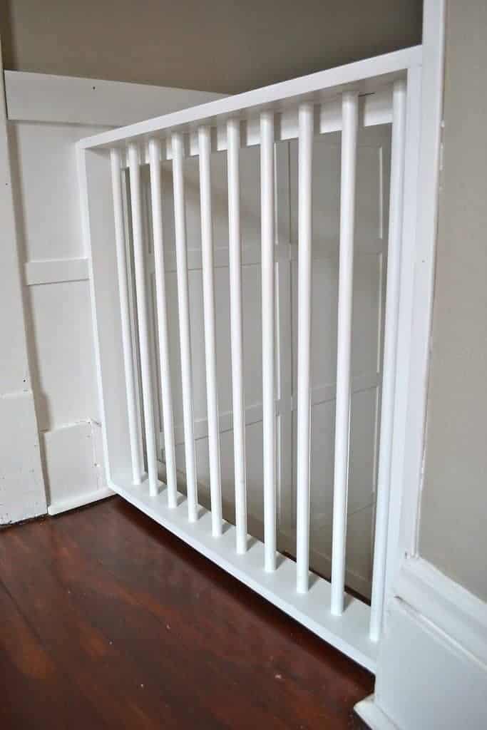 Cut the pine boards into nine vertical slats, each 30 inches long. Space them 3 inches apart (safe spacing that prevents head-trapping). Sand every edge until smooth so curious noses don’t get splinters. Screw the slats between two horizontal rails, then paint everything white to match your trim.