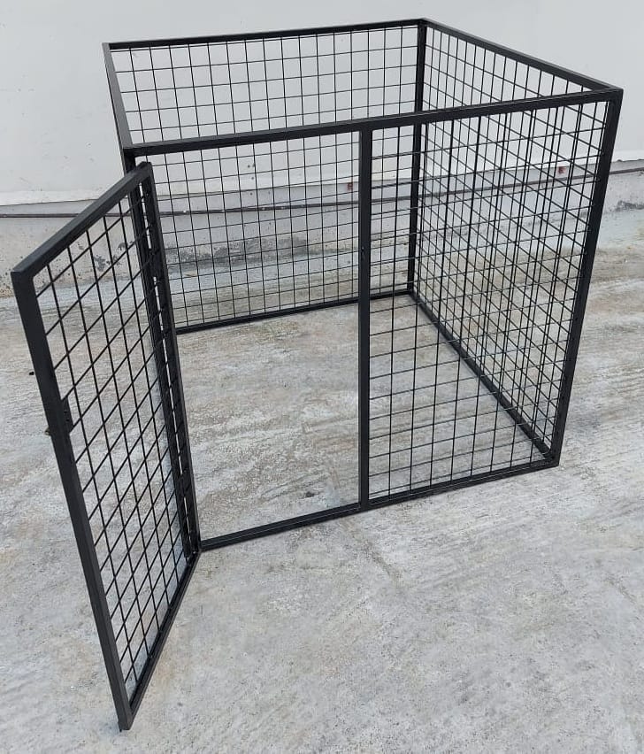 This is a black powder-coated steel welded wire pen, and it’s exactly the kind of thing that looks Pinterest-worthy but actually functions in real life. The square wire grid panels (each cell roughly 2″ x 2″) sit inside a 1.5″ steel square tube frame, and the whole structure stands about 4 feet tall — tall enough that even a bouncy golden can’t clear it.