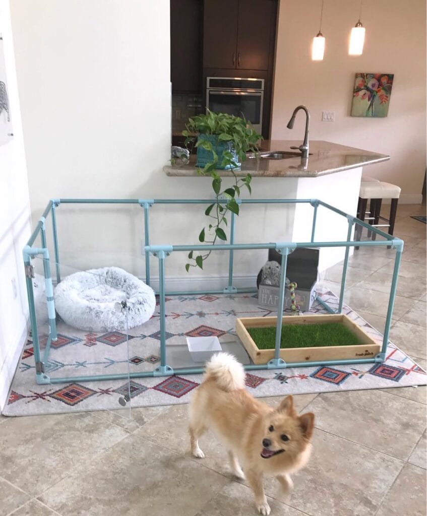 #4: Teal Acrylic Panel Dog Playpen (The Pinterest Setup Your Pup Actually Needs)