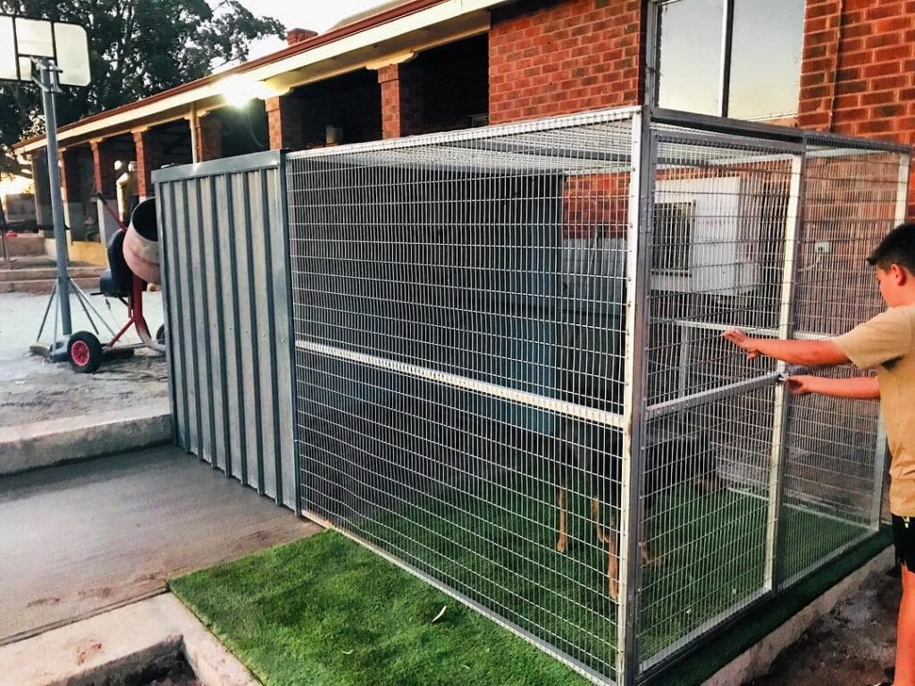 The left side of this kennel uses corrugated metal sheeting bolted to a timber or steel subframe, which creates a shaded shelter zone. Your dog gets a cool, protected space to rest, which means less overheating on summer afternoons and actually using the pen willingly.
