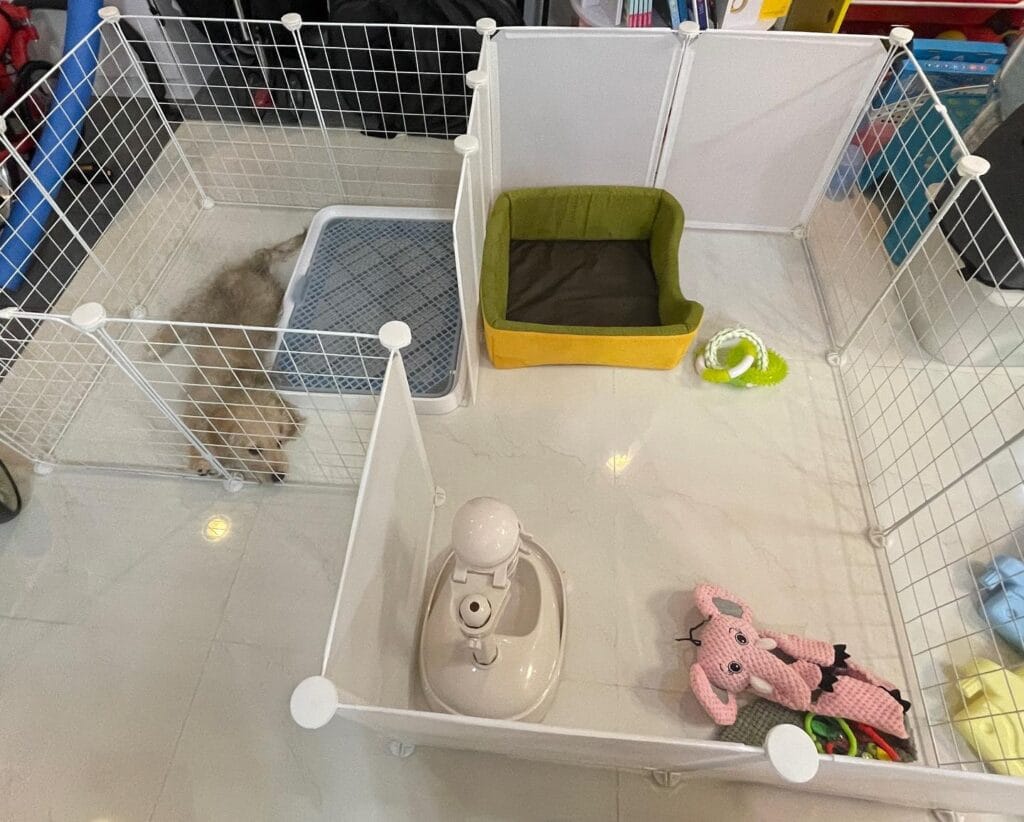 Position the gray potty tray in the upper left zone, away from the sleep corner. My dog Sundance figured out the designated potty spot within two days — I couldn’t believe it. Place the yellow and green fabric bed right next to it so the zones feel distinct.