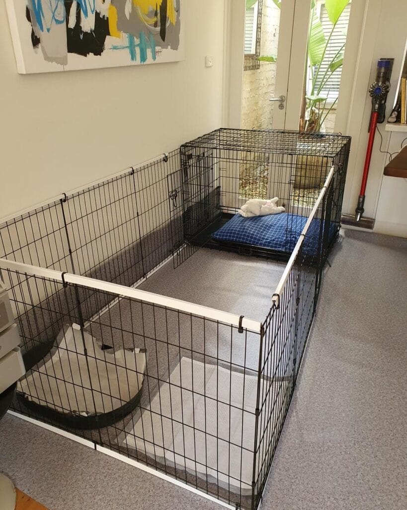 If you love the look of this pen, a DIY dog gate from repurposed materials pairs really well with this kind of modular setup for when you need to expand the space.