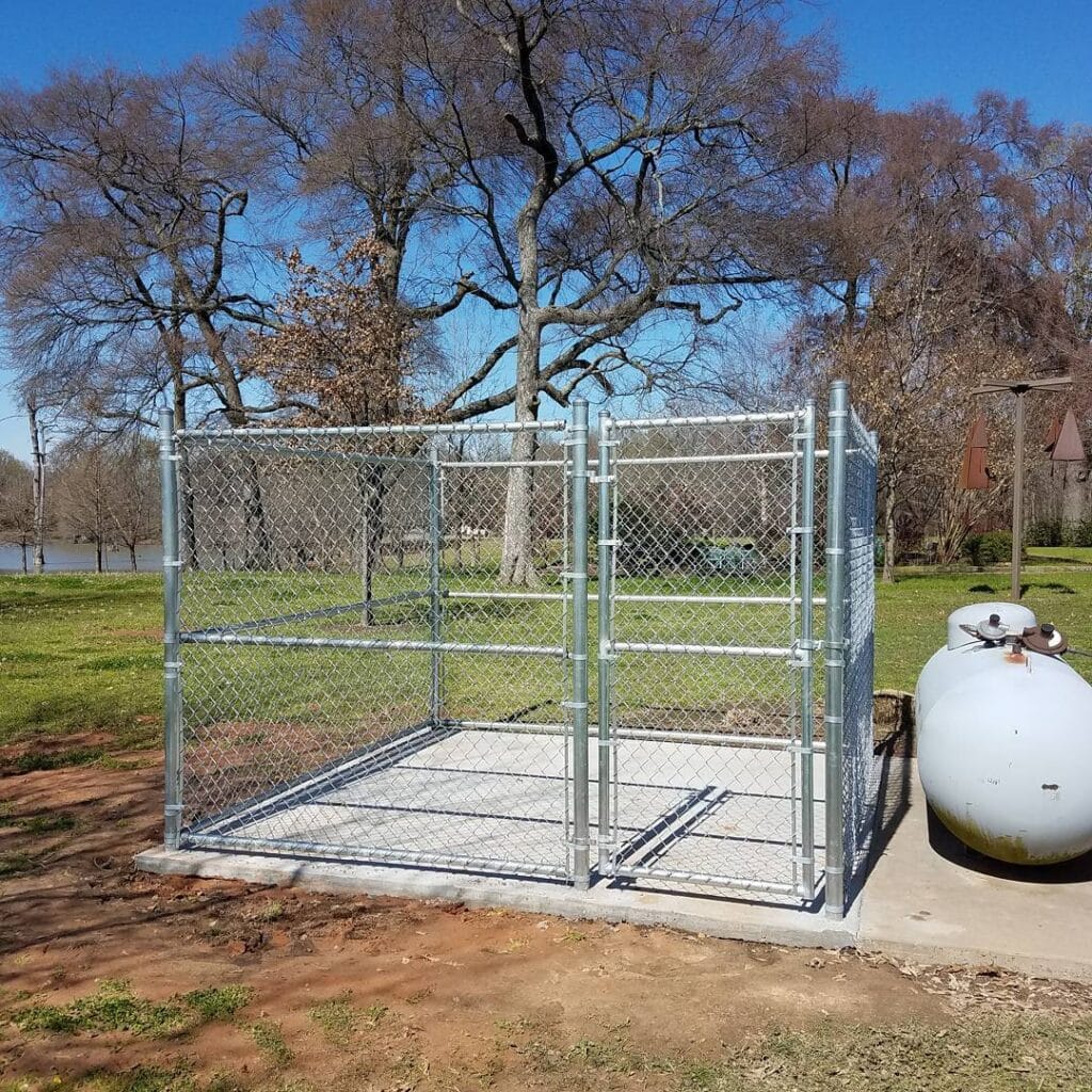 The whole setup sits next to a propane tank in the image, which actually shows smart placement — keeping the kennel near existing structures anchors it visually and practically.