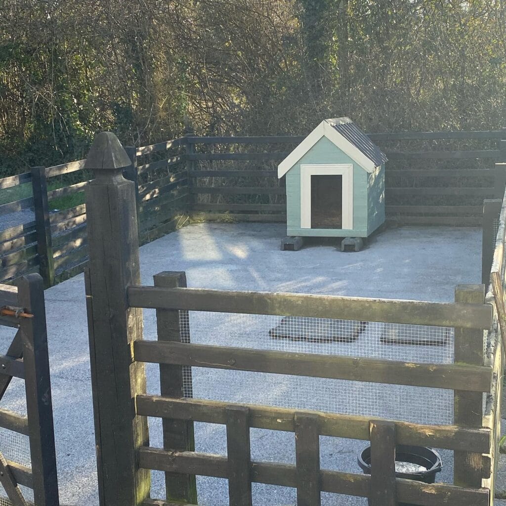 #8: The Sage Green Chicken Coop-Style Dog House Pen With Gravel Base