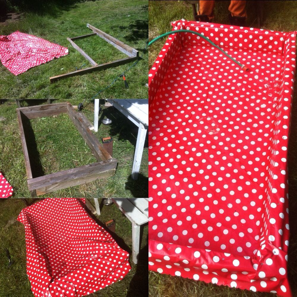 #7: DIY Wooden Frame Pool With a Polka Dot Tablecloth Liner