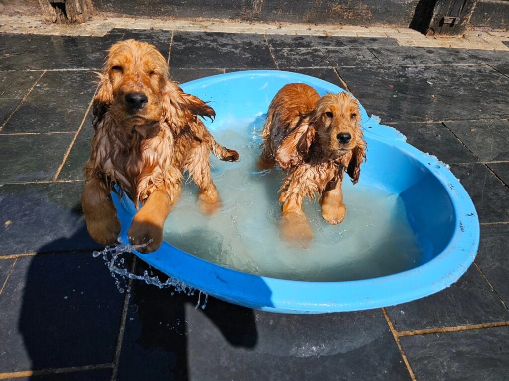 Fill the pool with about 4–6 inches of cool water — enough to cover your dog’s paws and ankles without overwhelming them. Place it directly on your slate or stone patio surface so it stays level and doesn’t tip when two excited spaniels decide to splash at once. (And trust me, two will always find their way in.)