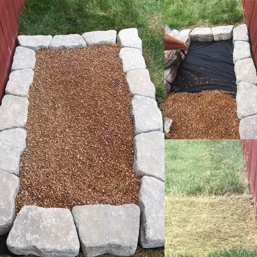 Start by mapping out your space and laying landscape fabric flat across the entire area — this blocks weeds and keeps the gravel from sinking into the soil over time.