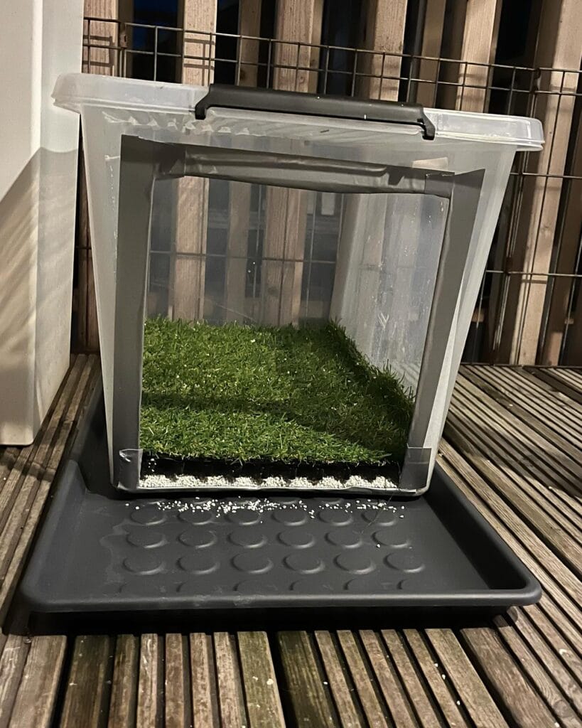 #8: DIY Indoor Potty Station Using a Clear Storage Bin (Balcony-Friendly!)